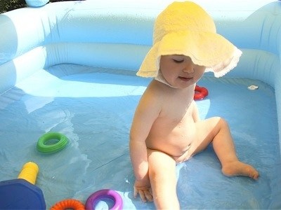 So summer seems to be finally putting in an appearance and seeing how much Maddie seems to like swimming / bathtime a paddling pool seemed like a great idea. It even comes with a roof to keep her out of the sun. (hence the shadows and the hat)